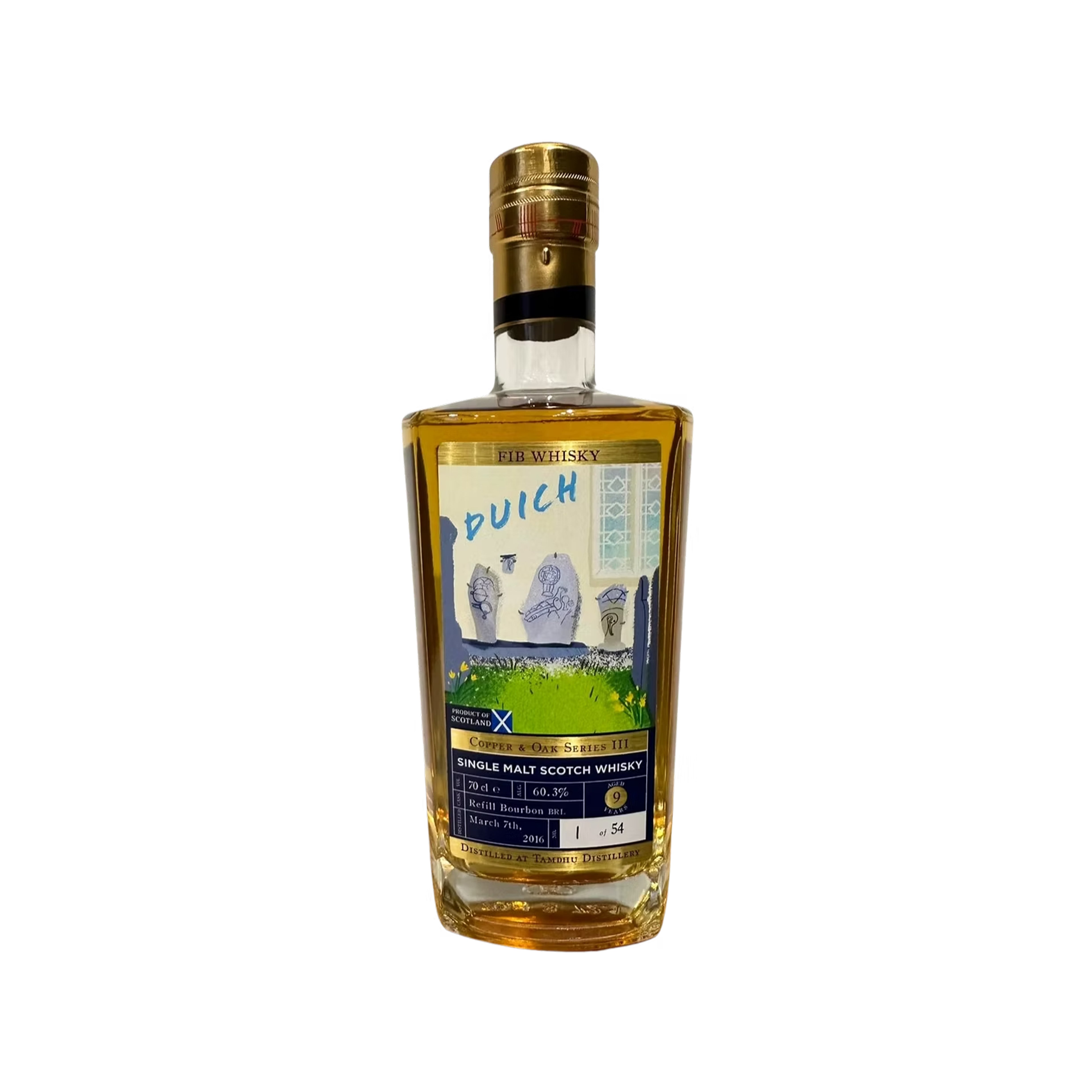 Distilled at the renowned Tamdhu Distillery, this rare single cask release—“Duich”—forms part of the Copper & Oak Series III. The label, created by artist Orla Stevens, features the historic Pictish stones of Inveravon Parish Church, paying tribute to Scotland’s rich cultural heritage.